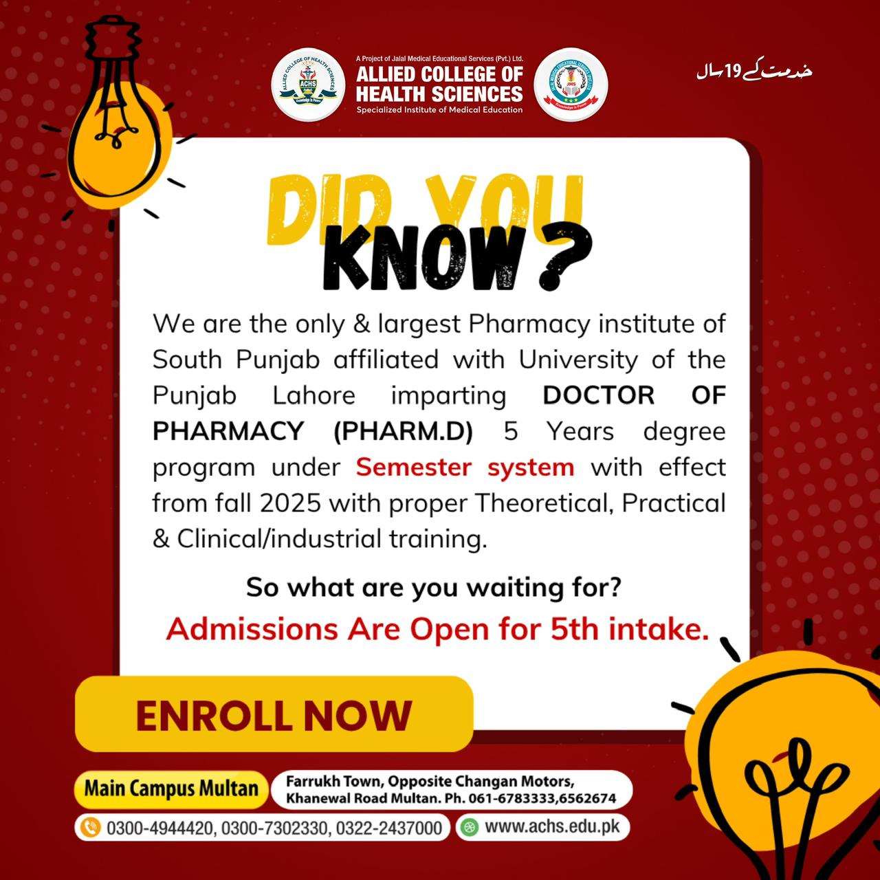 Min Matric (Science) with Min 45% marks or Matric (Arts) with Min 50% Marks